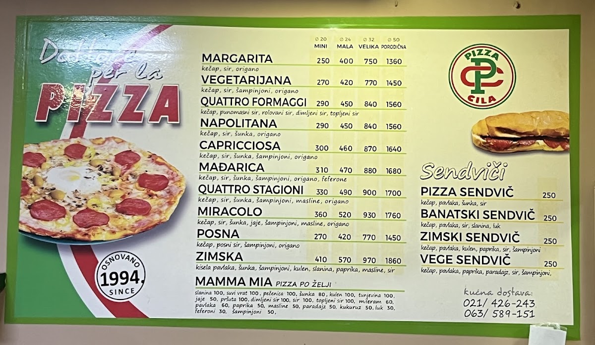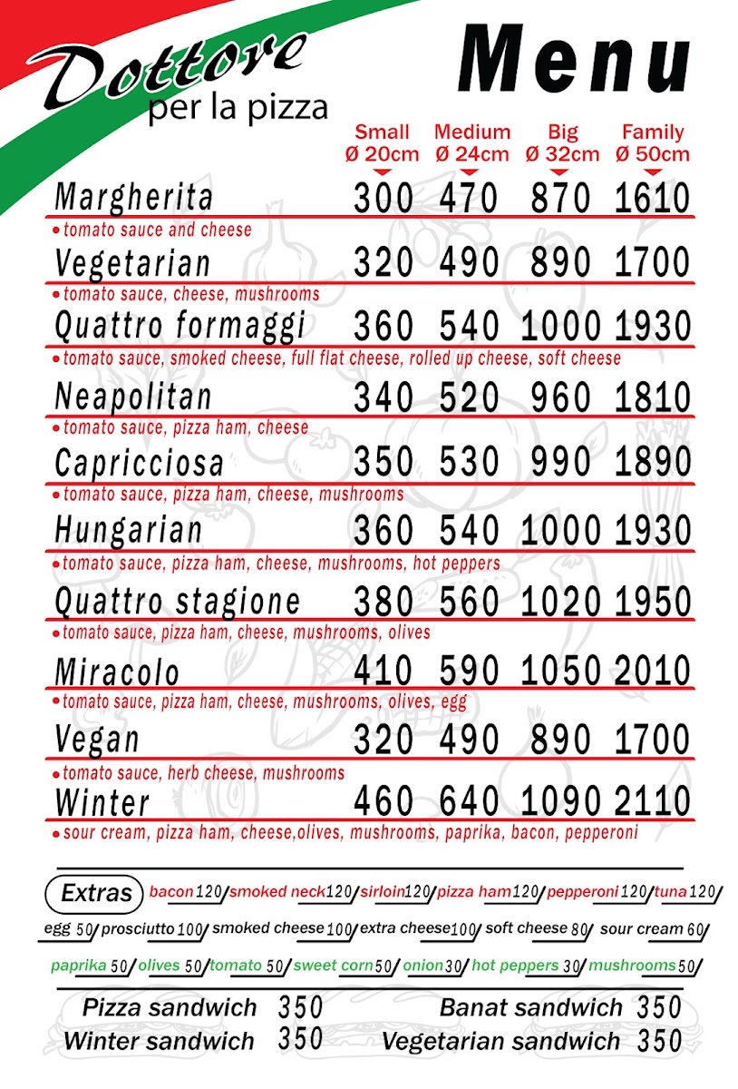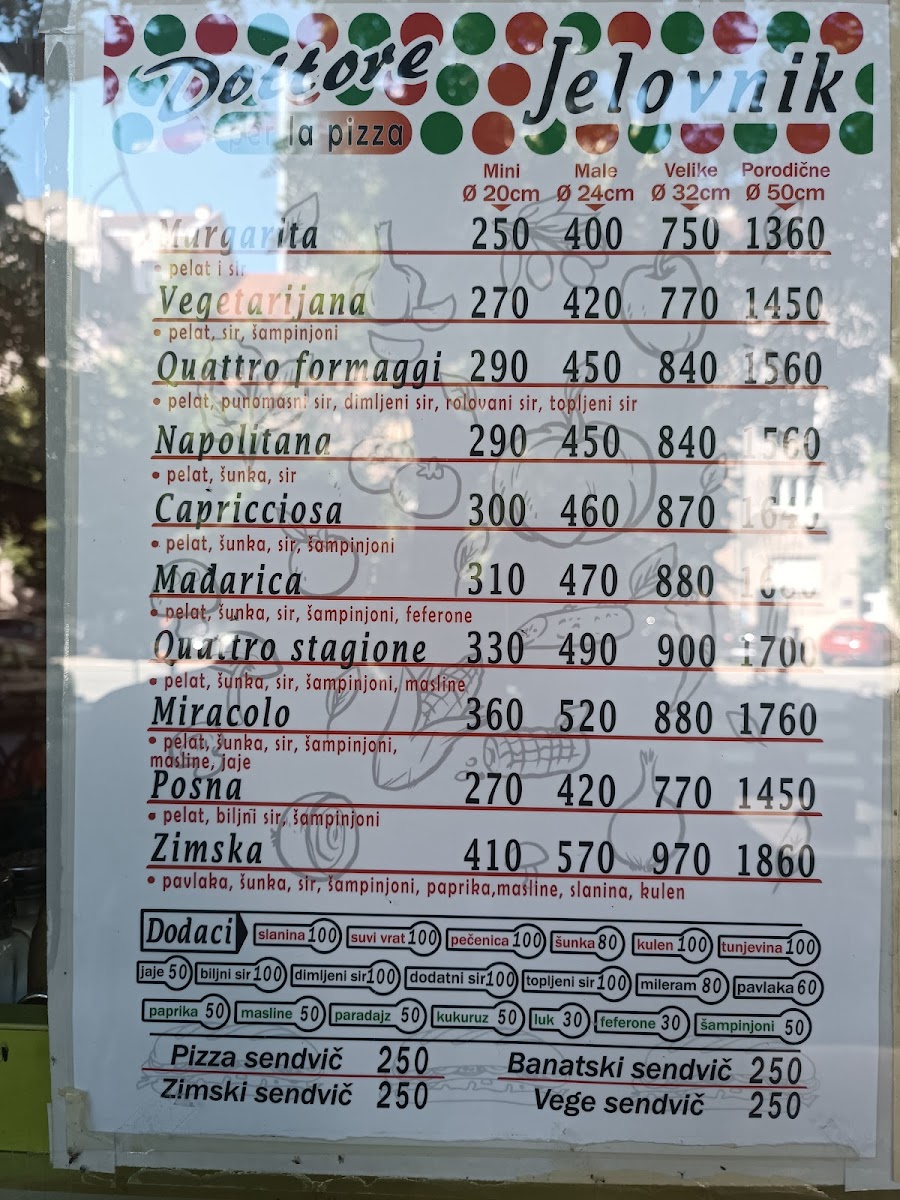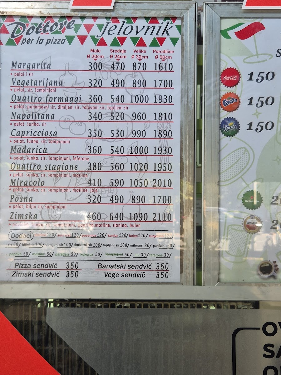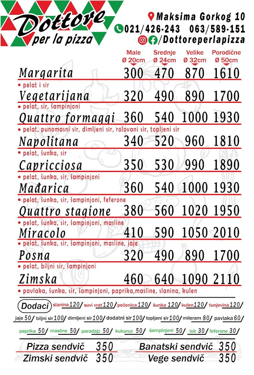 Dottore Per La Pizza in Novi Sad offers a well-curated menu that promises a delightful dining experience. The pizza selection is a standout, with options like the Margherita for €6.00, the classic Capricciosa at €8.50, and the more indulgent Quattro Stagioni priced at €9.00. For those who prefer a heartier meal, the Lasagna Bolognese at €7.50 is a must-try, rich in flavors and served in a generous portion. The menu also caters to different dietary preferences, with a variety of salads and vegetarian options. The Caesar Salad at €5.00 and the Vegetarian Pizza for €7.50 are perfect choices for lighter meals. The drinks menu is also varied, offering everything from soft drinks to local wines. Overall, Dottore Per La Pizza’s menu stands out for its quality ingredients, reasonable prices, and a delightful array of options that cater to different tastes.